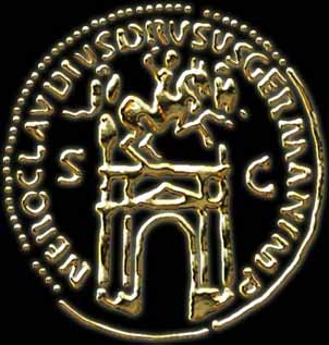 The following "seal" corresponds to the flip side of the same coin, showing an arch built for Emperor Claudius' father, Nero Claudius Drusus Germanicus.